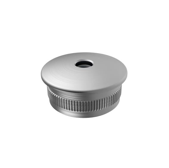 Edelstahl-Endkappe für das Geländer mit Gewinde. Verbindung (Druck) durch Aufschlagen über die Riffelung.