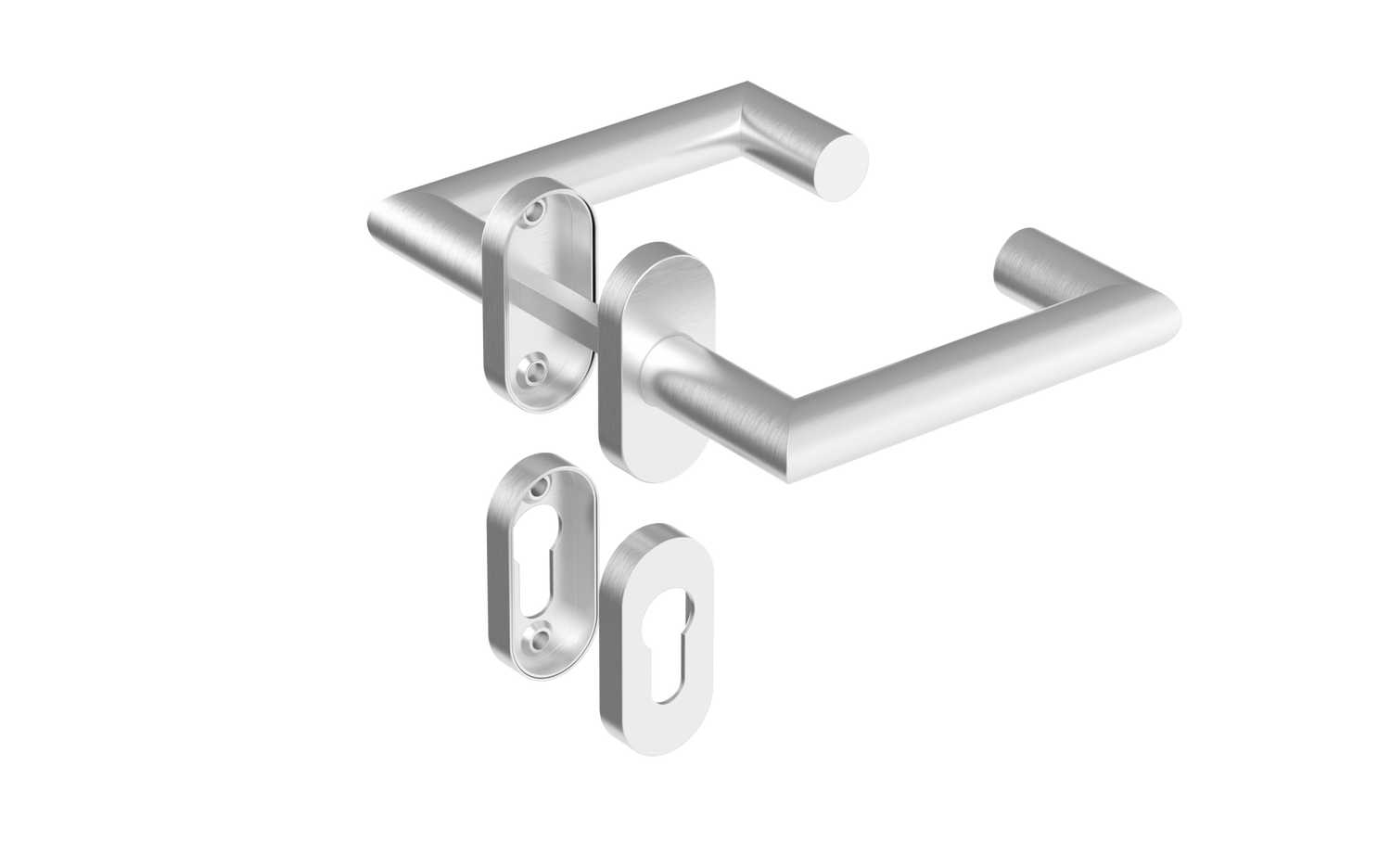Maniglia con piastrina per cilindro - 1paio - acciaio inox spazzolato, possibilita di rotazione del meccanismo a molla per invertire la direzione di apertura