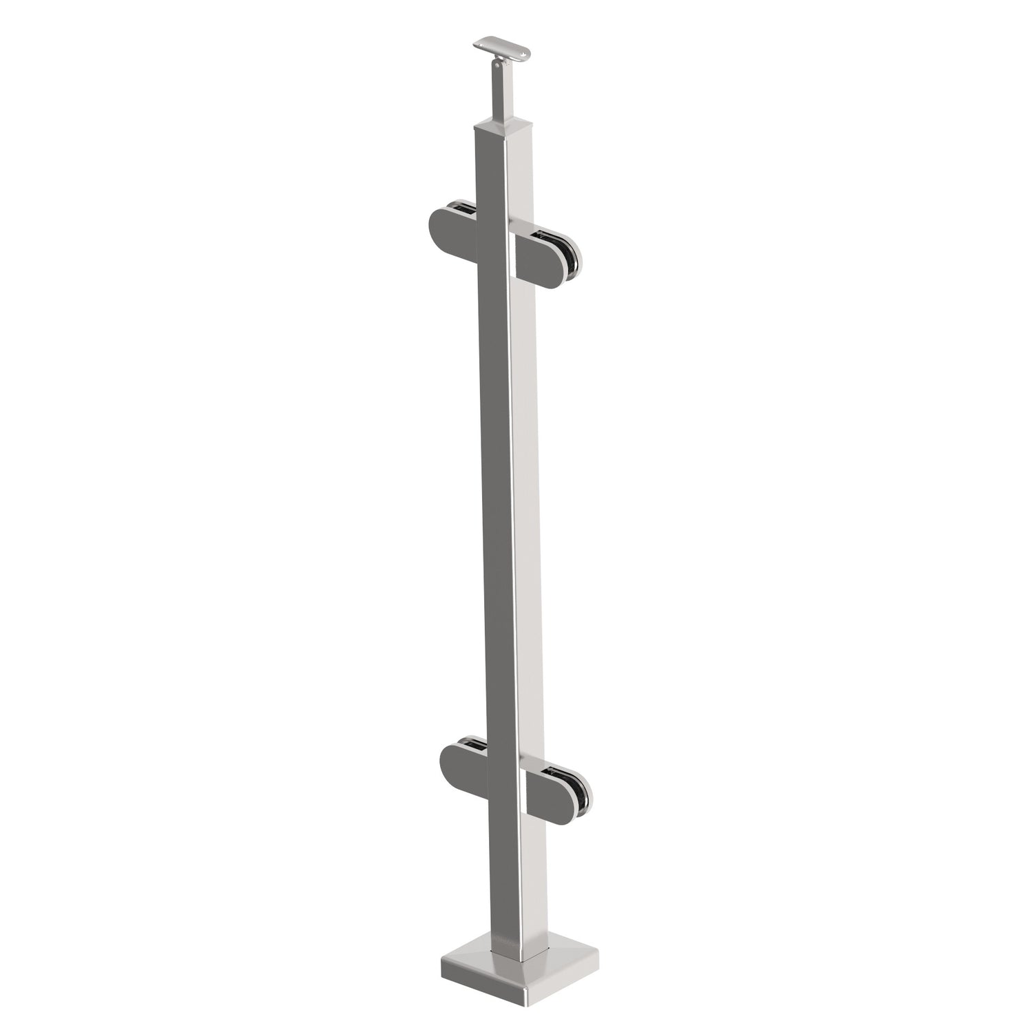 Palo in acciaio inox con flangia di ancoraggio saldata e rosetta di copertura. Il palo include un supporto regolabile per il corrimano e supporti per vetro (per vetro di spessore 8,76 mm). Viene utilizzato per realizzare una ringhiera alta 1000 mm con vetro come palo interno. Il materiale di ancoraggio non e incluso.