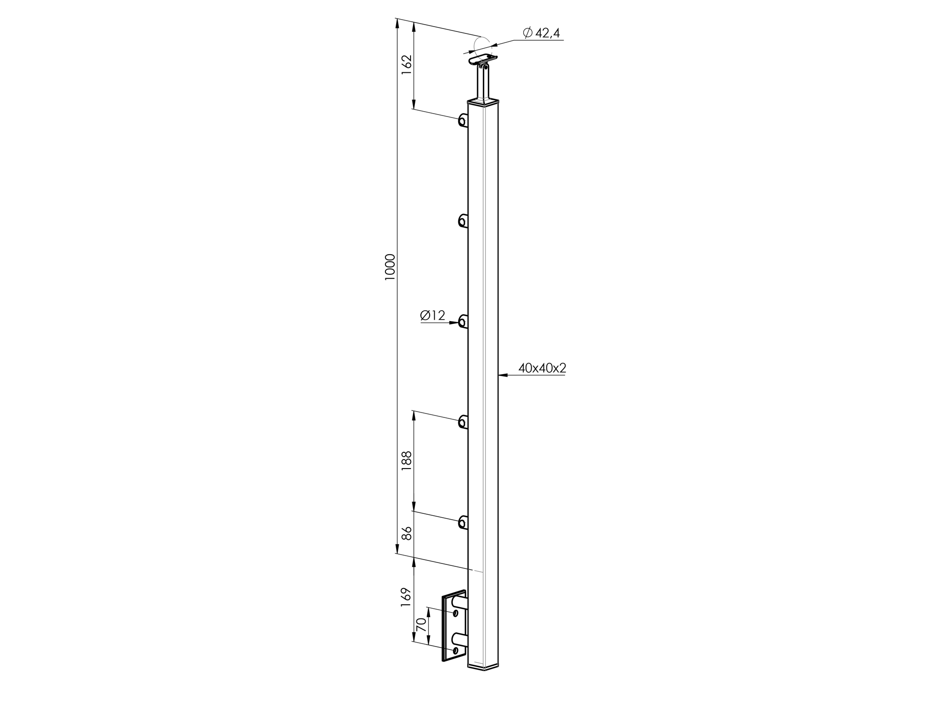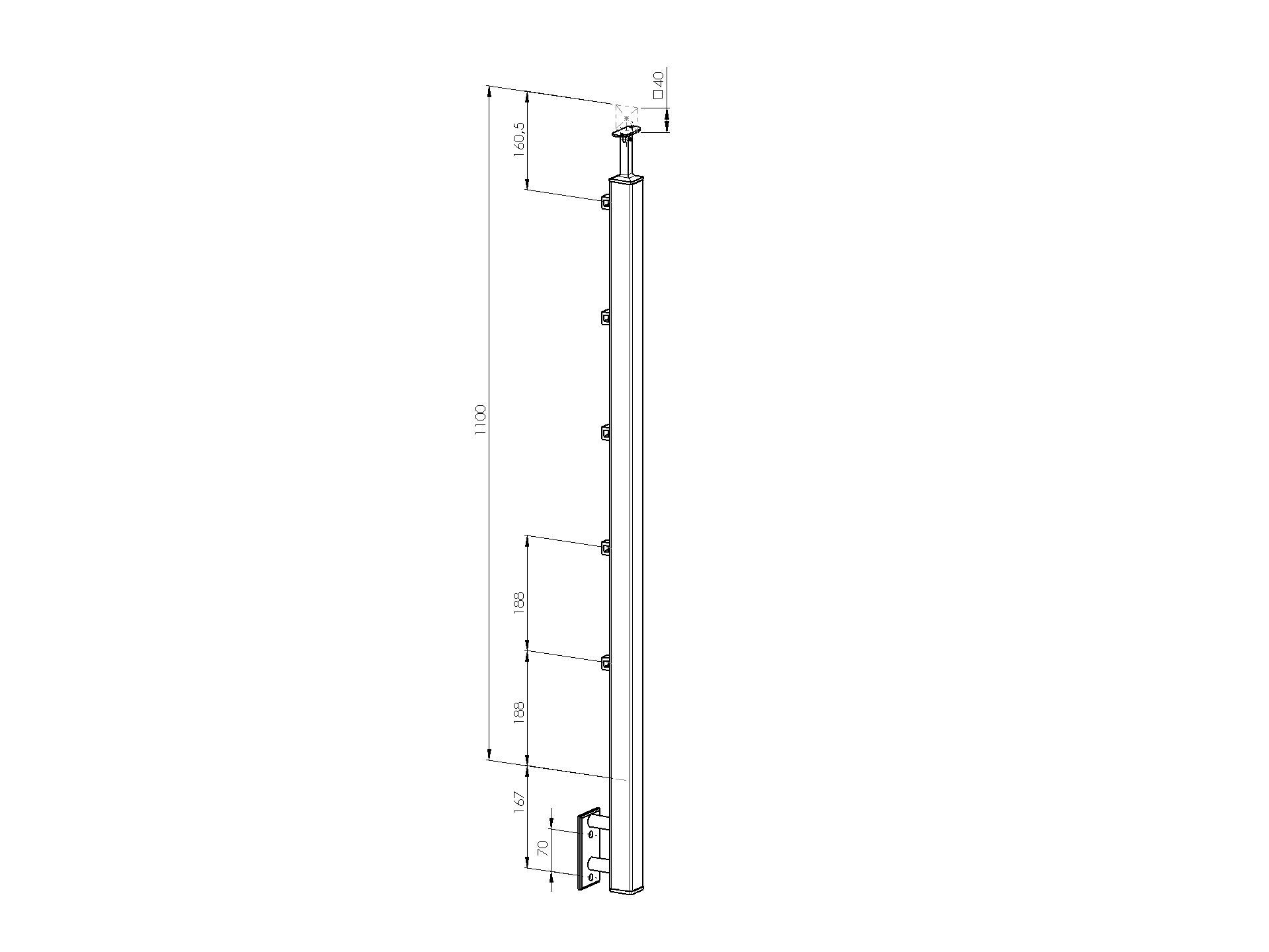 1 pzMaterialeAcciaio inossidabile AISI 304FinituraSatinatoMontante40x40x2Accessori obbligatoriAncoraggio laterale rettangolare A6/005-4