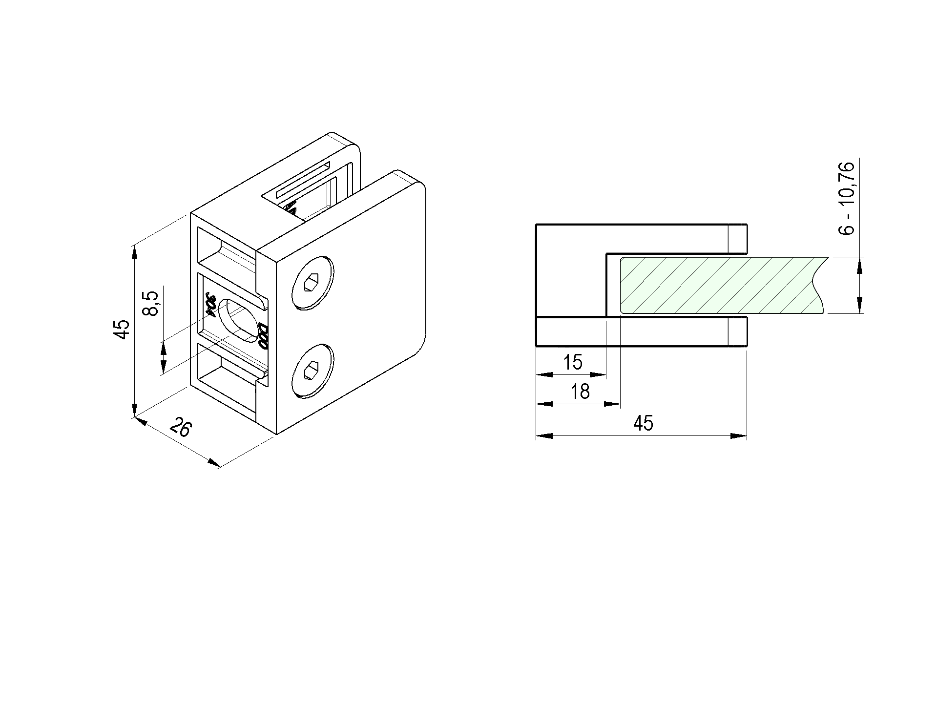 Il supporto per riempimenti in vetro (lamiera, lastra) è un elemento costruttivo utilizzato per fissare e stabilizzare il riempimento in vetro o lamiera in varie strutture, come ringhiere, balconi o scale. Questo supporto assicura un fissaggio solido e sicuro del riempimento, aumentando così la stabilità e la sicurezza complessiva della struttura. Fanno parte delle soluzioni architettoniche moderne che combinano funzionalità, sicurezza e aspetto estetico. Nella scelta del supporto è importante considerare il suo materiale, design, funzionalità e compatibilità con il riempimento specifico e la struttura complessiva. Il fissaggio del riempimento - assicurazione contro la caduta è ottenuto tramite un giunto a morsetto (consigliato per l'ancoraggio superiore). Il supporto non include guarnizioni (necessità di acquistare separatamente 2 pezzi di guarnizioni in base allo spessore del vetro) e coperture per le viti.