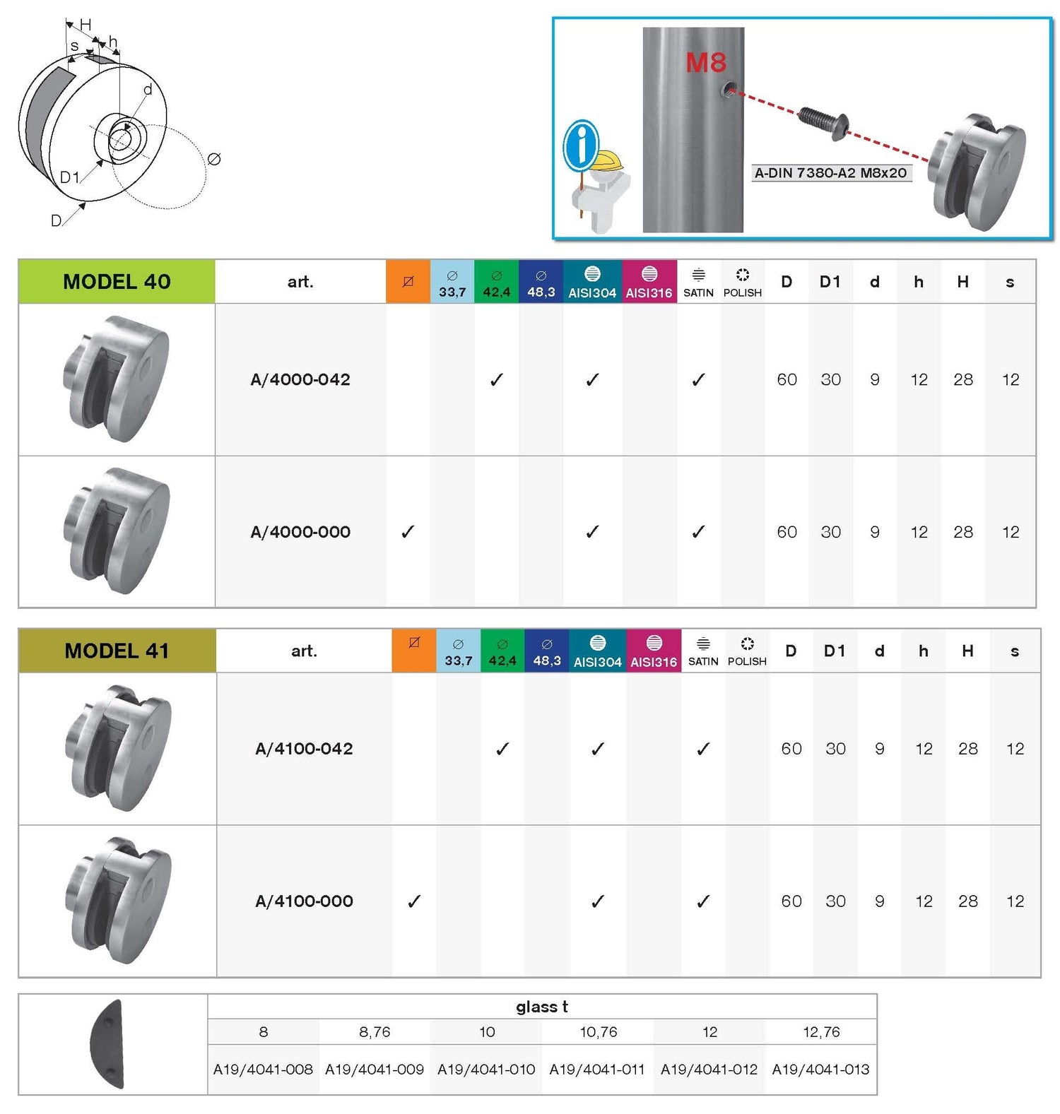 Materiale: Acciaio inossidabile AISI 304, Finitura: Satinato, Riguardo: Il vetro, vetro t: 8/8,76/10/10,76/11,52/12/12,76, Montante: D42,4, Modello: Modello 40, 41
