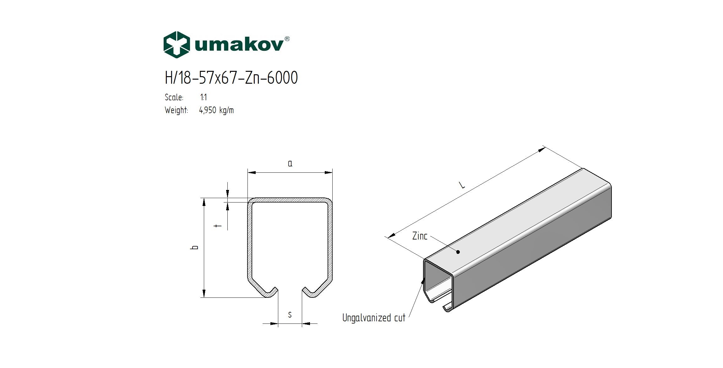 Profilo guida sospeso Zn, 57x67x3mm, L6m H/18-57x67-Zn-6000