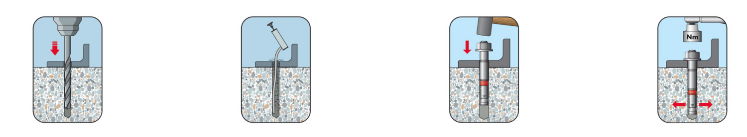 L'ancoraggio e adatto per il fissaggio di staffe, strutture in acciaio, canaline per cavi, prefabbricati, tettoie, gru a ponte, gru, officine, strutture metalliche, grandi gallerie, tetti a sbalzo, verande e tutto cio che e a sbalzo.