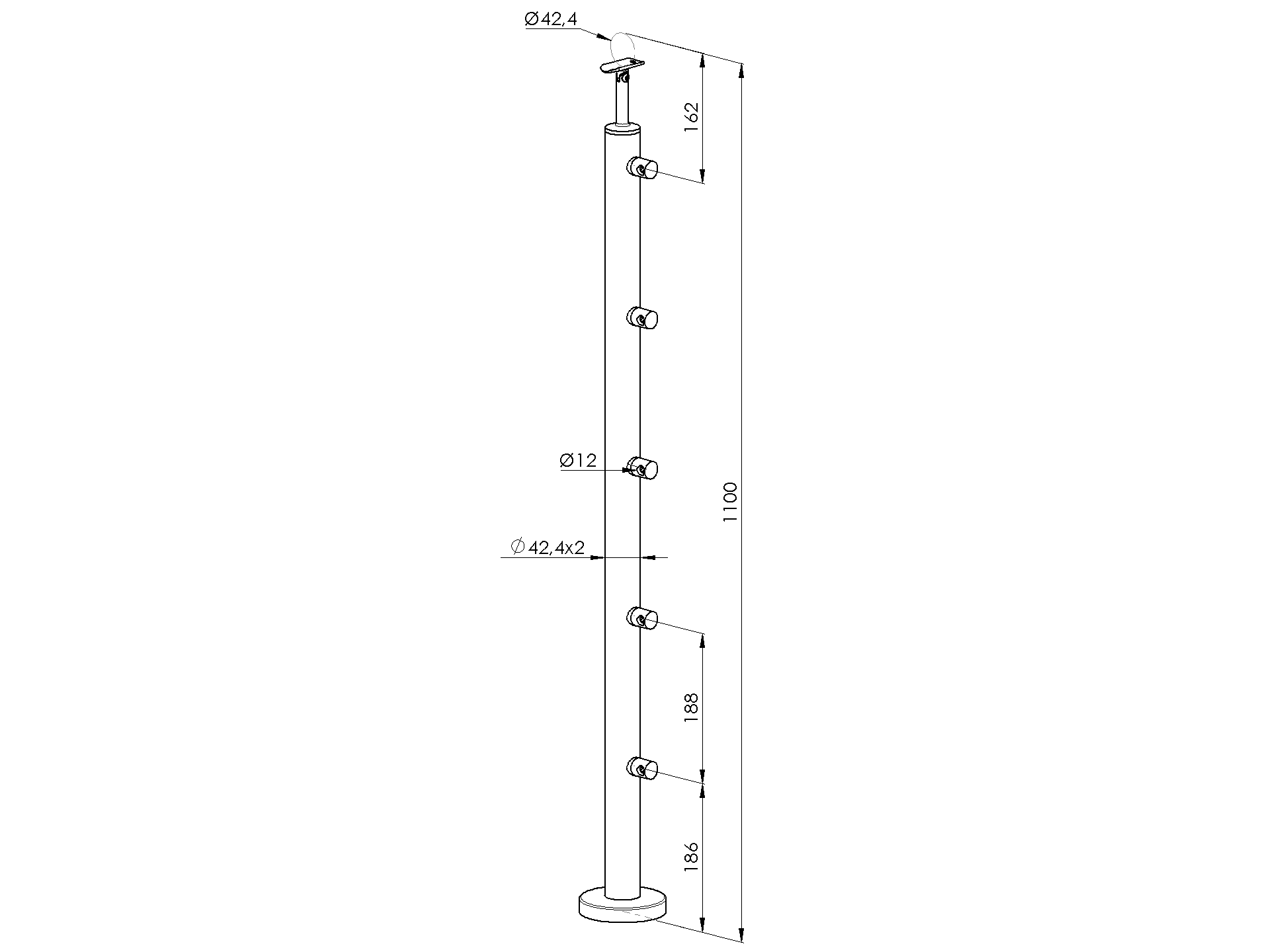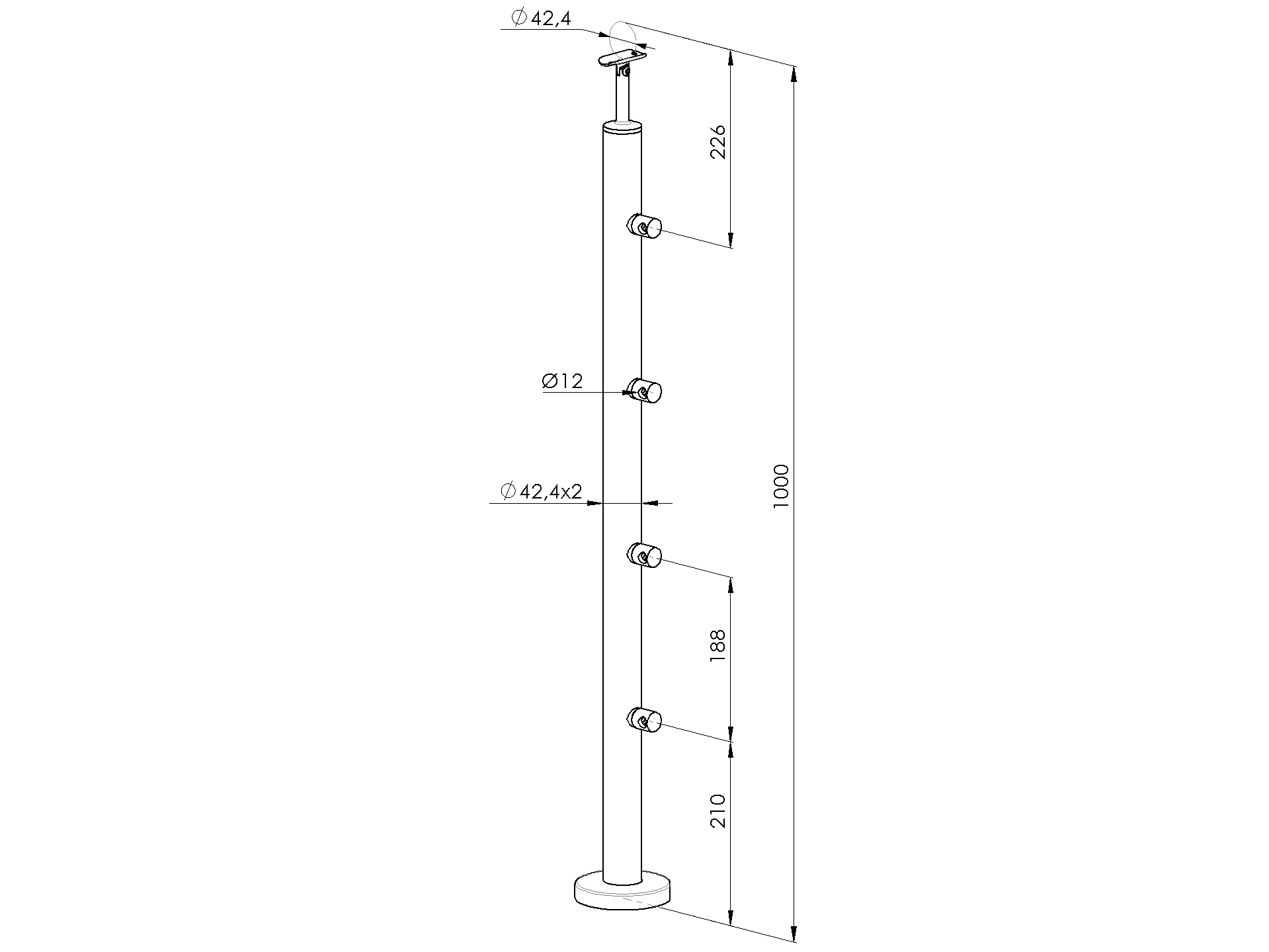 Materiale: Acciaio inossidabile AISI 304, Finitura: Satinato, Montante: D42,4x2, Corrimano: D42,4x2, b: 17, D: 103, d: 42,4