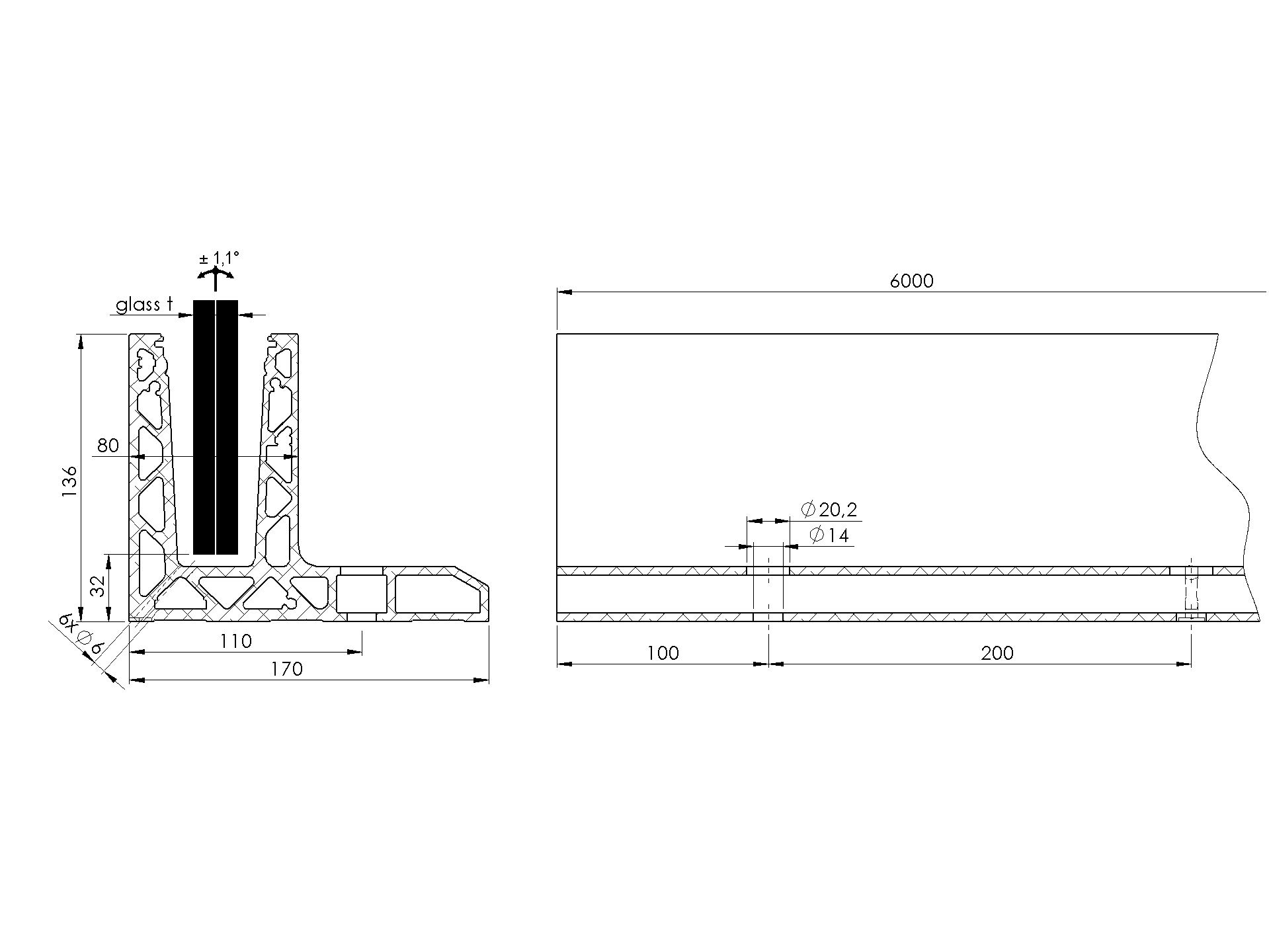 Parapetto in vetro intero-profilo cavo-fissaggio superiore AL/0018-6000-S-E
