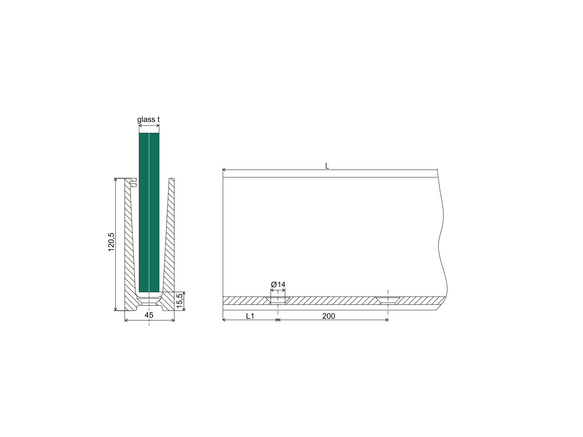 Celosklenené zábradlie-profil-bočný-vnút.odvodneny AL/0005-D-5000-S-E-Drain